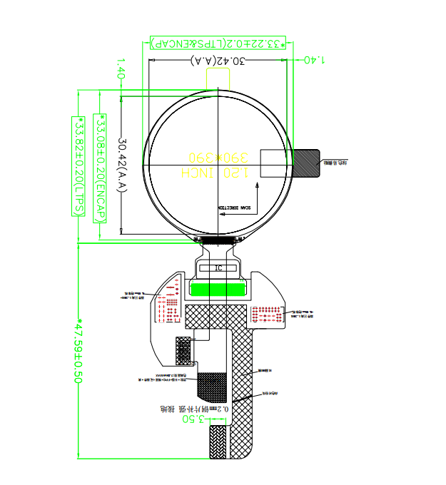 GL120AMC11B is a small round color OLED screen with a capacitance touchscreen. This OLED display has a 1.2-inch diagonally measured active display area with (390 horizontal by 390 vertical pixels)resolution.